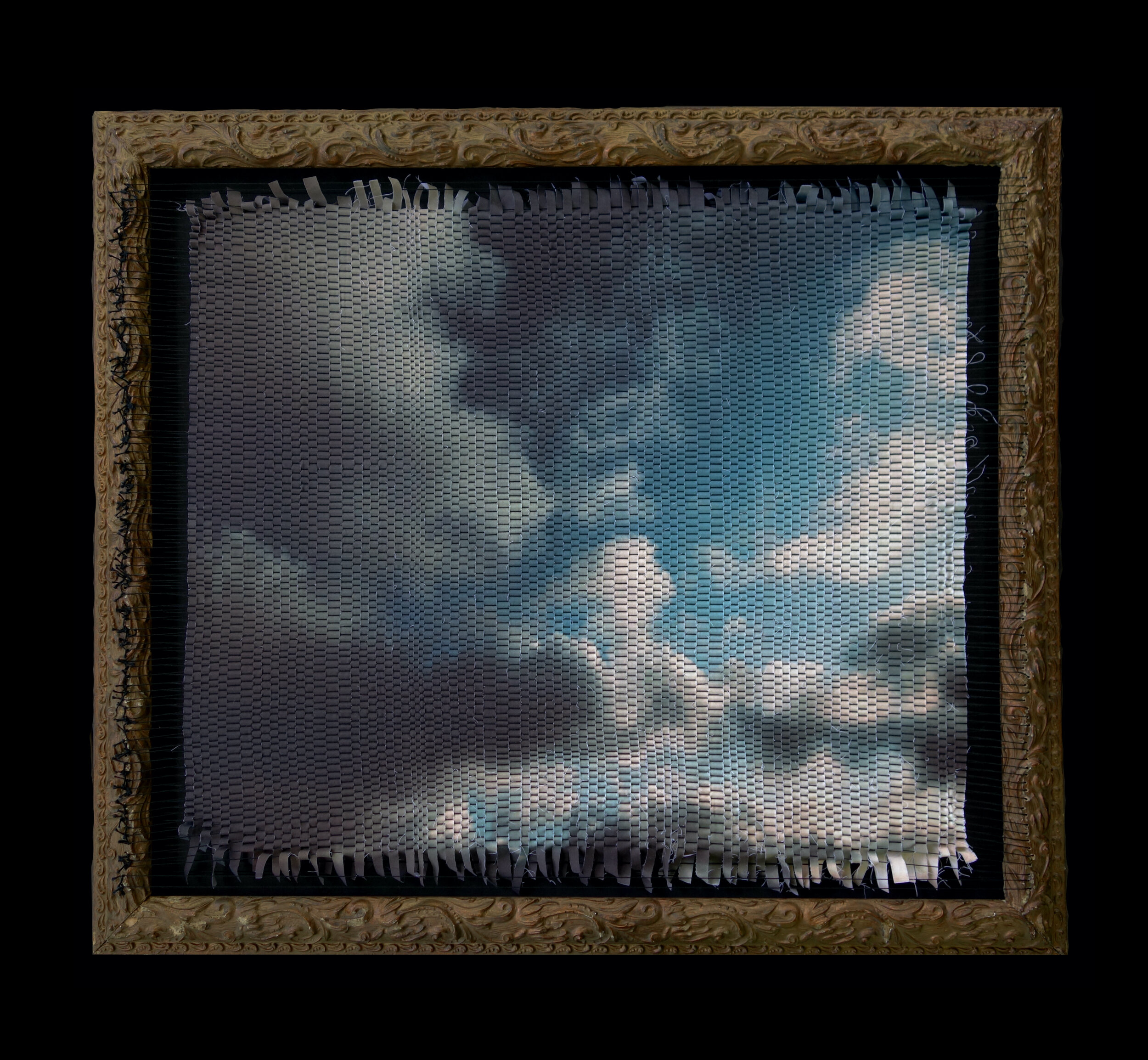 iPhone photograph on cotton-linen cloth, cotton string, vintage triptych frame. 99” x 52”