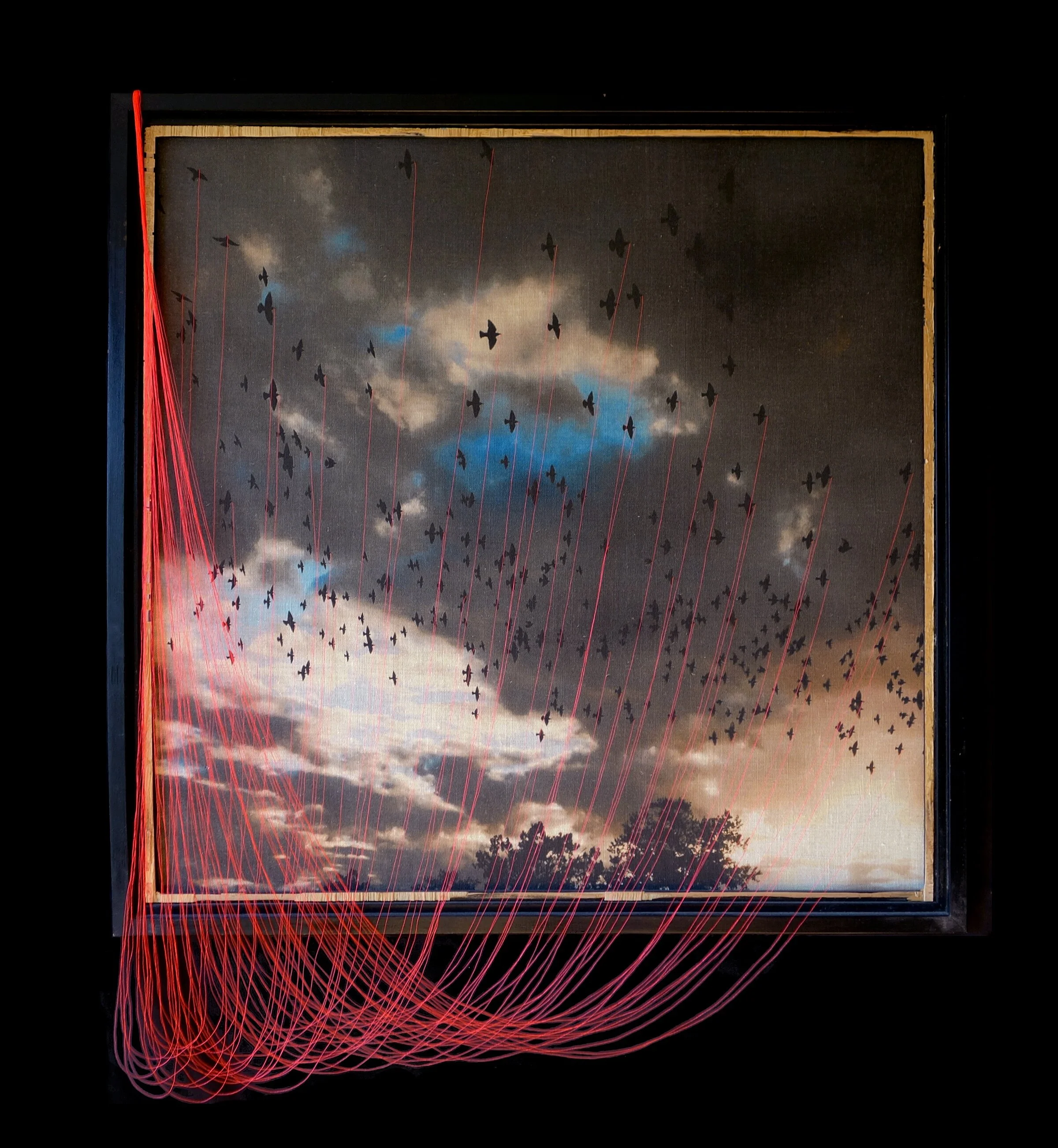 iPhone photograph on linen-cotton, organza, thread, frame.